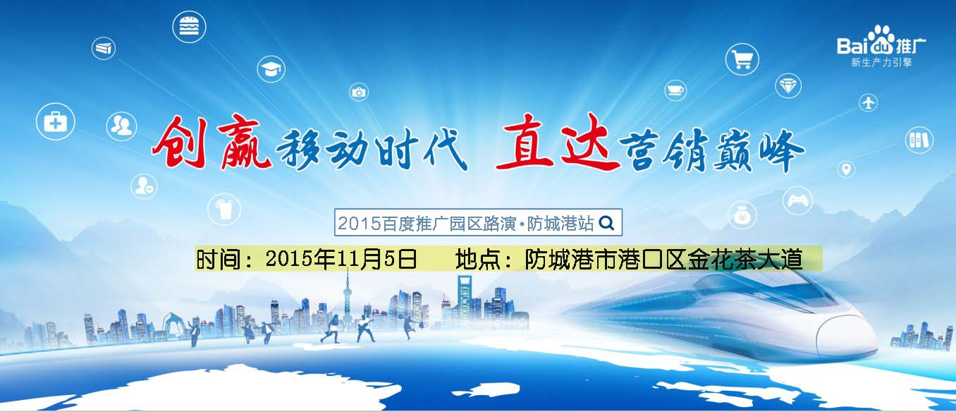 2015年11月5日,“創贏移動時代,直達營銷巔峰”——2015百度推廣園區路演·防城港站誠摯邀請您的參與,為您帶來移動互聯時代最新的營銷理念,分享移動營銷案例,幫助您拓展更廣闊的市場,把握移動營銷新商機,創贏移動時代新未來。