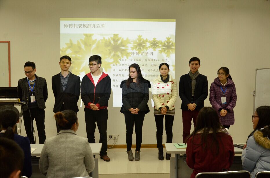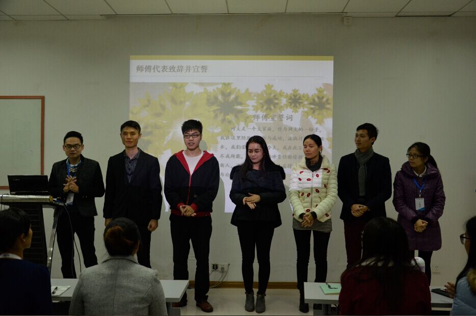 師傅與徒弟分別宣誓,結成師徒關系,今后師傅將教授徒弟專業只是和工作技能,徒弟將遵從師傅教誨,用心學習、努力工作!