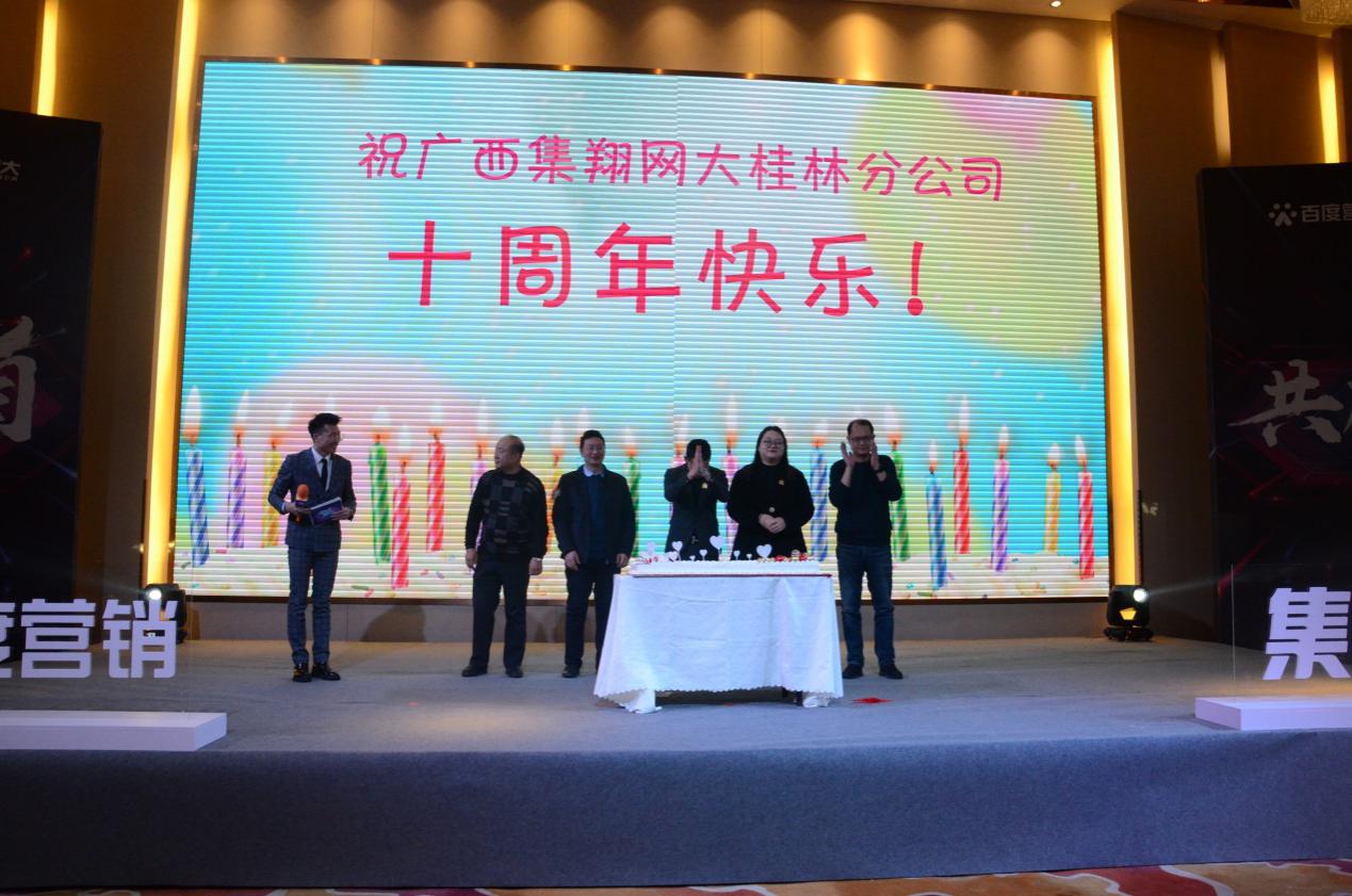 活動接近尾聲,廣西集翔網(wǎng)大區(qū)域運(yùn)營副總張清斌、廣西集翔網(wǎng)大桂林分公司總經(jīng)理陸慧、桂林廣告協(xié)會會長王海勇、桂林景區(qū)協(xié)會會長閆林、桂林旅行社協(xié)會常務(wù)副會長張博共同為廣西集翔網(wǎng)大桂林分公司切蛋糕慶生,也預(yù)祝現(xiàn)場嘉賓來年事業(yè)大鵬一日同風(fēng)起,扶搖直上九萬里。隨后廣西集翔網(wǎng)大區(qū)域運(yùn)營副總張清斌在臺上與全場嘉賓共同舉杯,感謝所有客戶朋友在這十年來的信任與支持,并祝愿大家在新的一年繁榮昌盛!